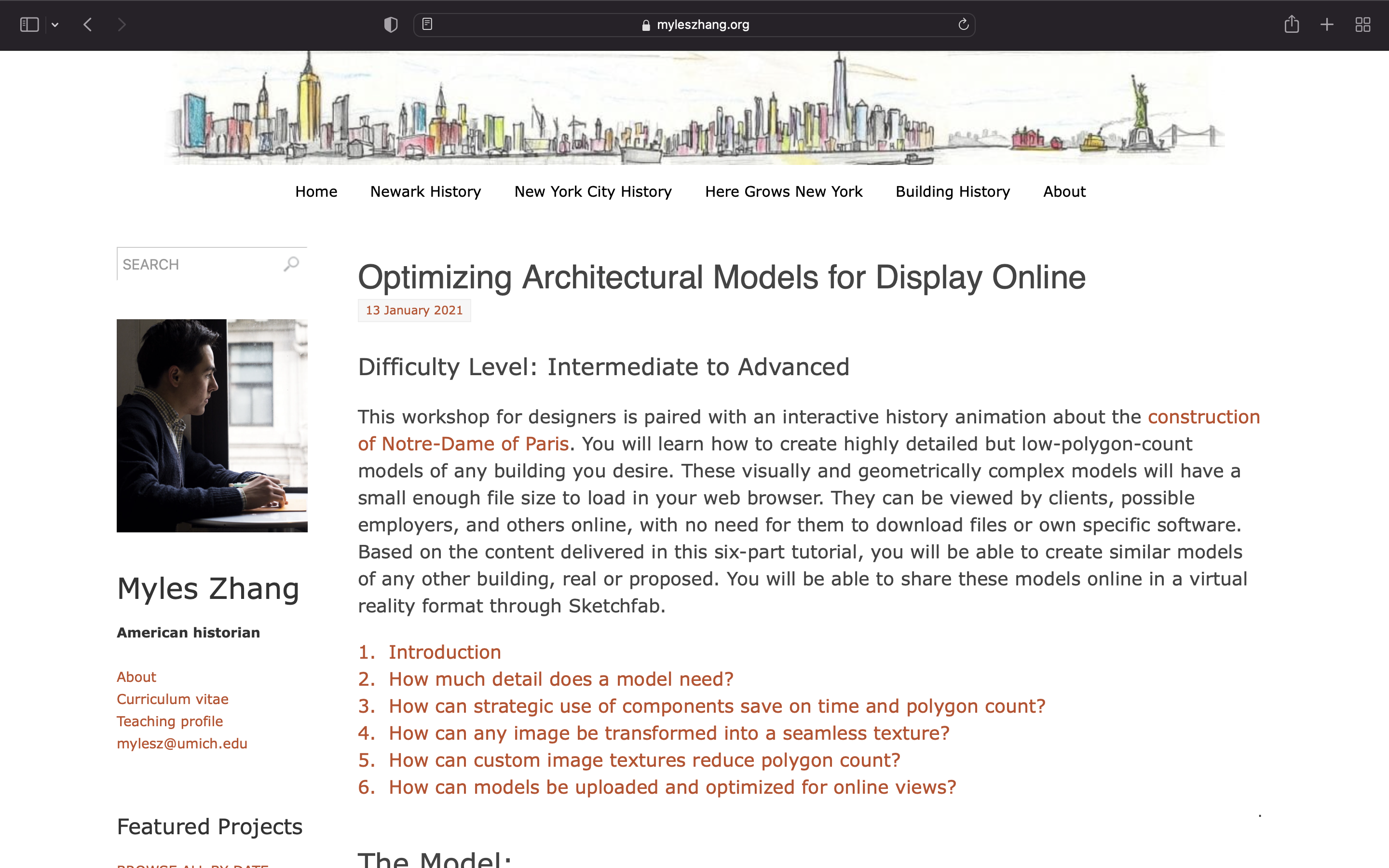 This workshop for designers is paired with an interactive history animation about the construction of Notre-Dame of Paris. You will learn how to create highly detailed but low-polygon-count models of any building you desire. These visually and geometrically complex models will have a small enough file size to load in your web browser. They can be viewed by clients, possible employers, and others online, with no need for them to download files or own specific software. Based on the content delivered in this six-part tutorial, you will be able to create similar models of any other building, real or proposed. You will be able to share these models online in a virtual reality format through Sketchfab.